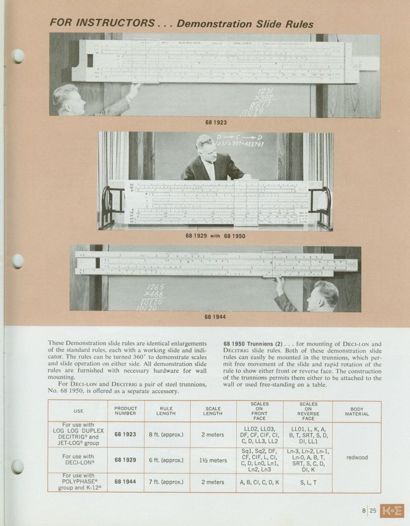 many other woods. The 1936 catalog, although listing just the Model 100 and 101, has a note at the bottom of the page stating Demonstration slide rules, with the scales of the K&E Log Log Trig (equivalent to the 4080) and Log Log Decitrig Slide Rules (equivalent to the 4081), are also available. The 1962 catalog, calls the 4053 Model 100 now as 69-1944, the 4081 Log Log Decitrig Slide Rules as 68-1923, and a new Demonstration Slide Rule for the Decilon 68-1100, called Model 68-1929 is now available.