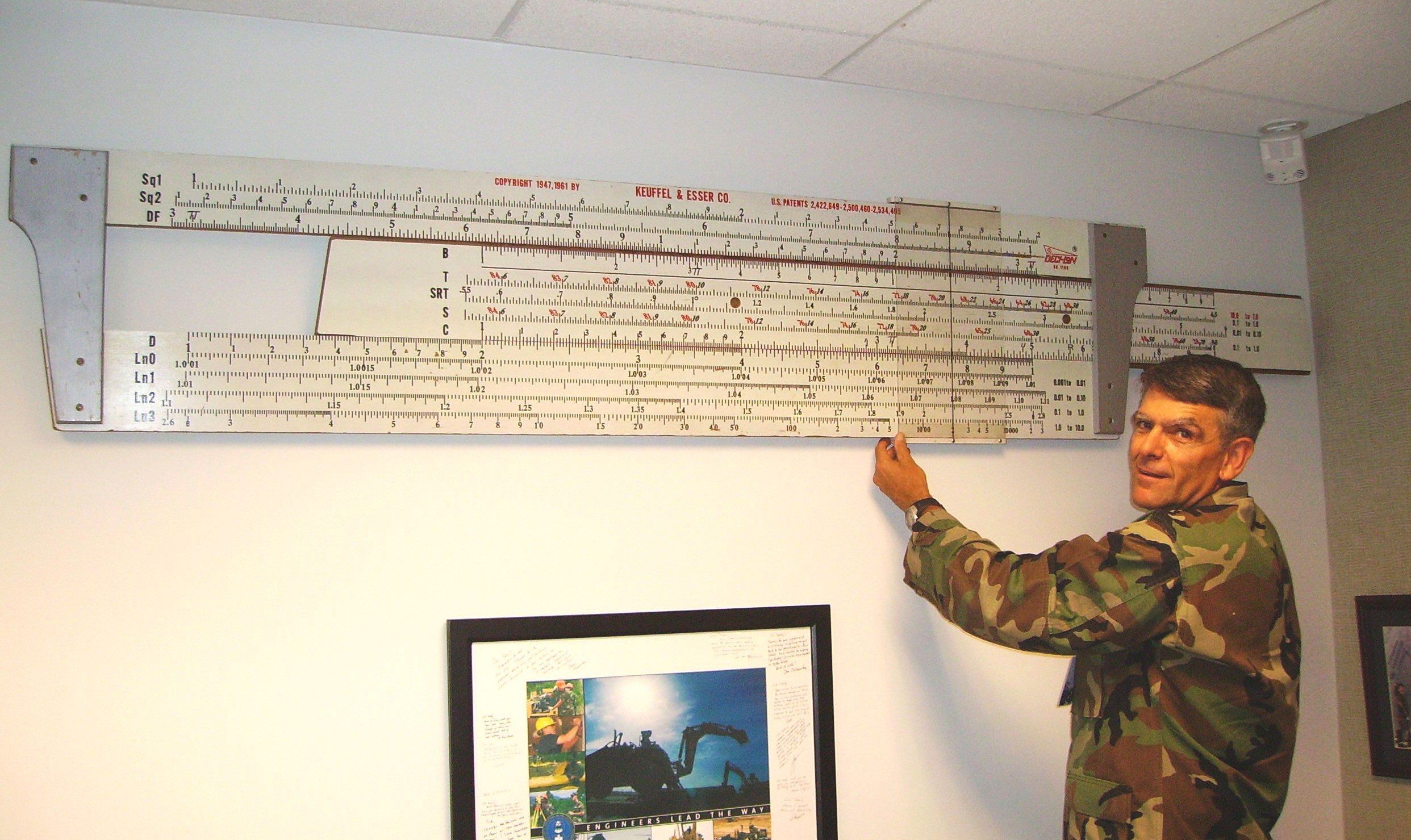 Model 1010-ES - 7 ft![]() ![]() Donated to www.SlideRuleMuseum.com by Tom Grosh (on right), now located at the Computer History Museum. Notice another Pickett Trainer, a 4ft 500-ES reflected in the mirror with hoards of slide rules in the lower right corner.