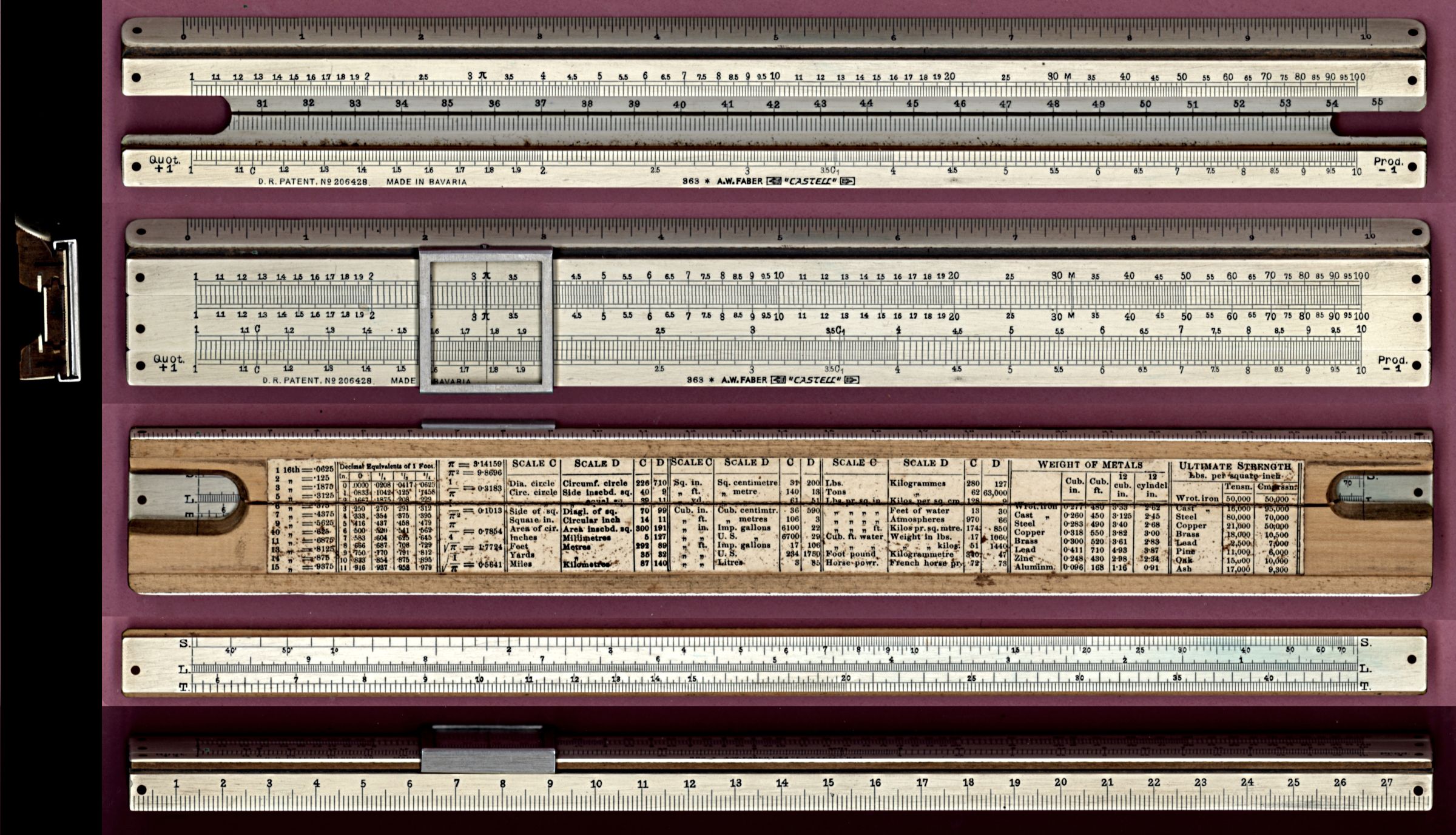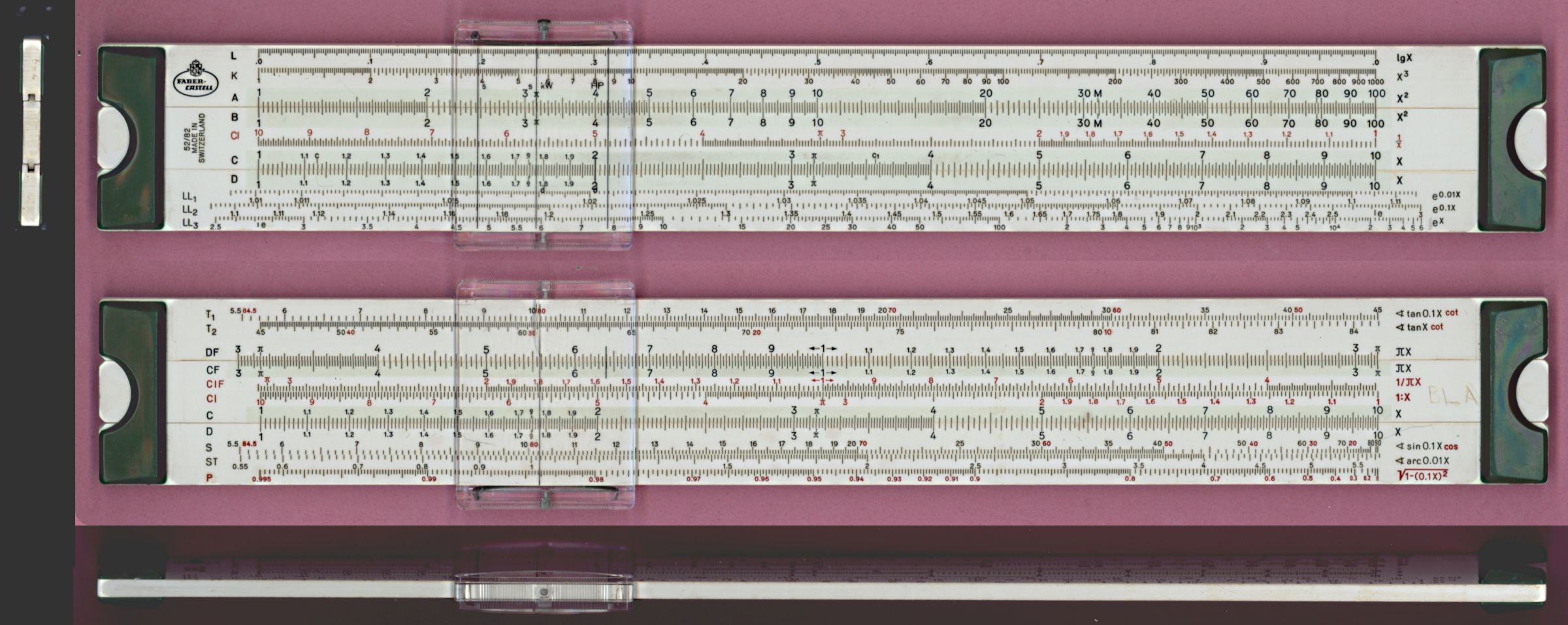 Faber-Castell 63/82 Biplex Made in Germany - 24 scales Front Scale: L, T1, T2, A [ B, BI, CI, C ] D, S, ST, P Back Scale: LL03, LL02, LL01, K [ K', C, CIF, CF ] DF, LL1, LL2, LL3 Multiple hairlines: 360, d, A, KW, PS Gift of Leroy G. Hausler Collection |
