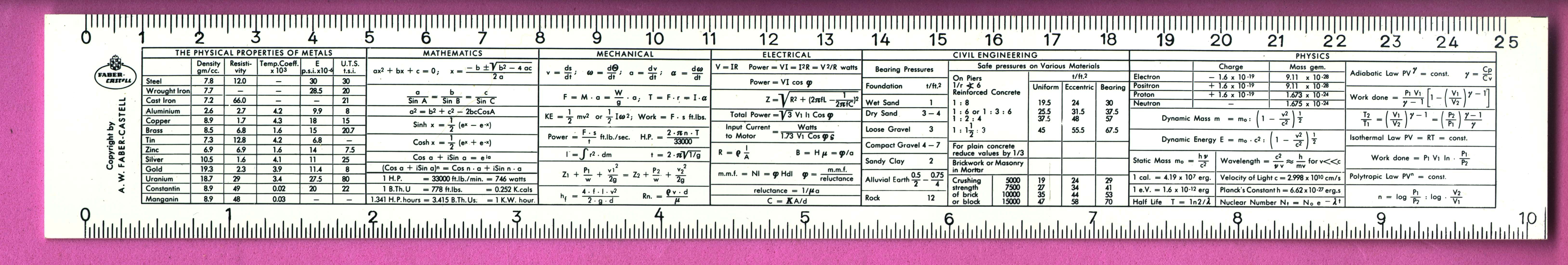 A.W. Faber 1/60 Mannheim Made in Germany - Date code 750 (July 1950). Railroad Track Scales Front Scale (extended) 10in // A [ B, CI, C ] D || 30cm Back Scale: [sin cos, lg, tg ctg Note: The stock is 30cm long. When you extend the slide, the reading of the left edge of the slide on the inch scale in the well gives the overall length of the stock and slide. Back: Equivalents (English) Gift Of Mike Weaver, UK |