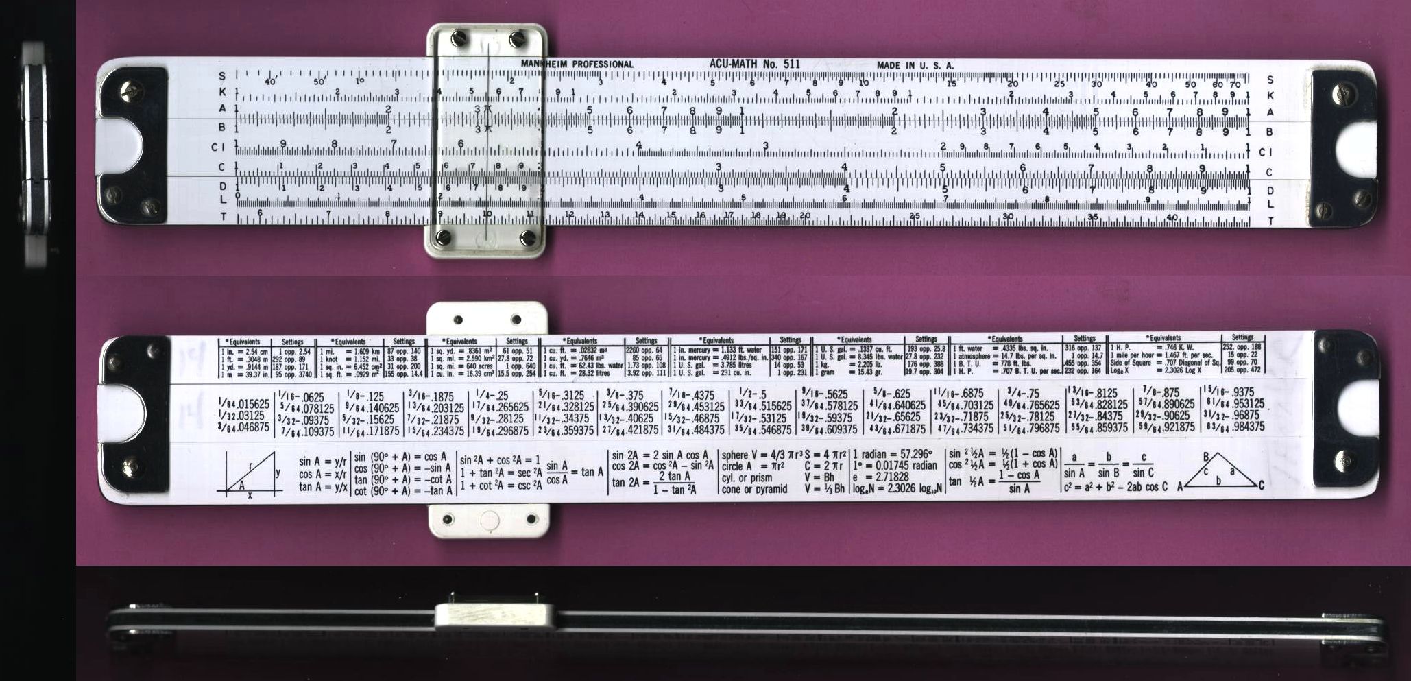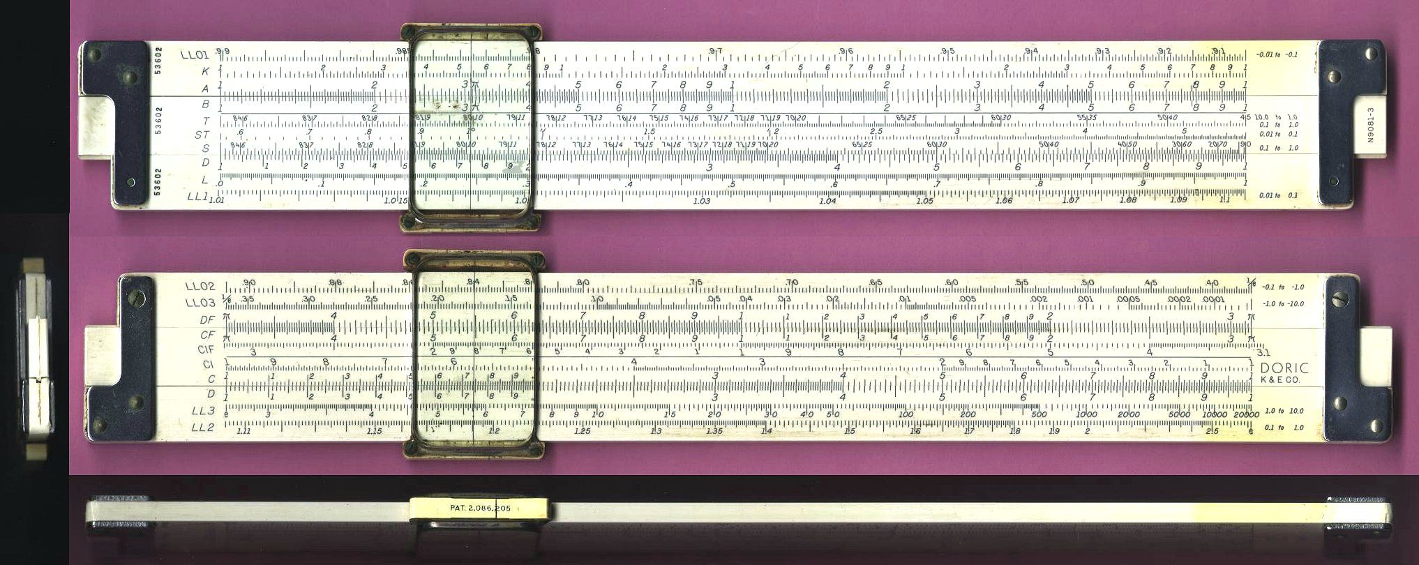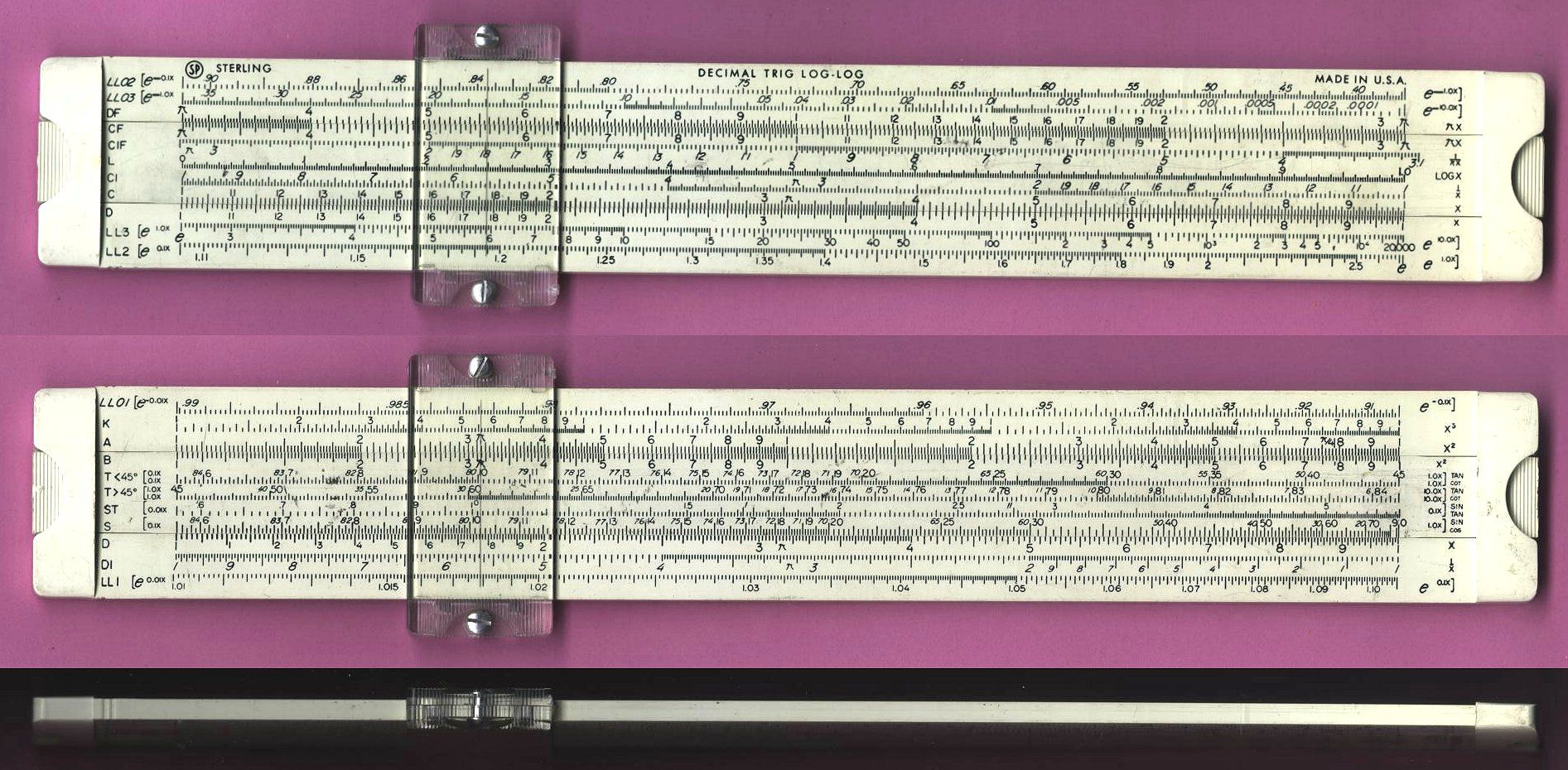 Acu-Math 130 Log Log Decimal Trig Magnesium with finger pocket on slide. | LL00, LL00, K, A [ B, K, CI, C ] D,S, ST, T L, LL, DF [ CF, CIF, CI, C ] D, LL3, LL2 |