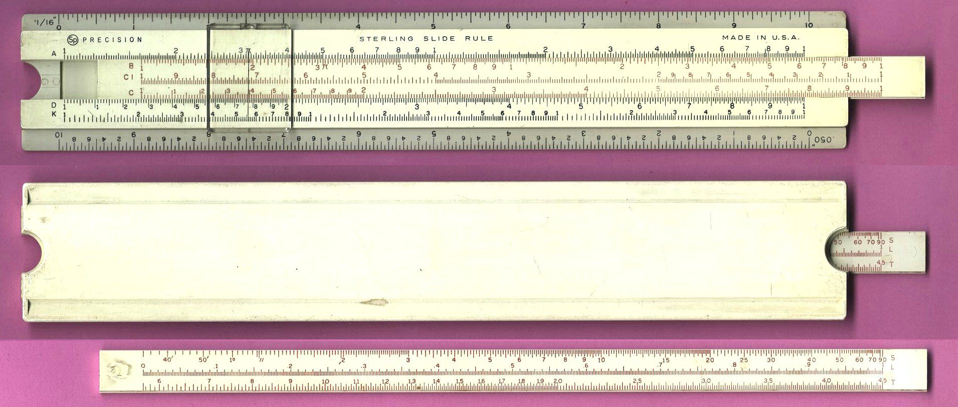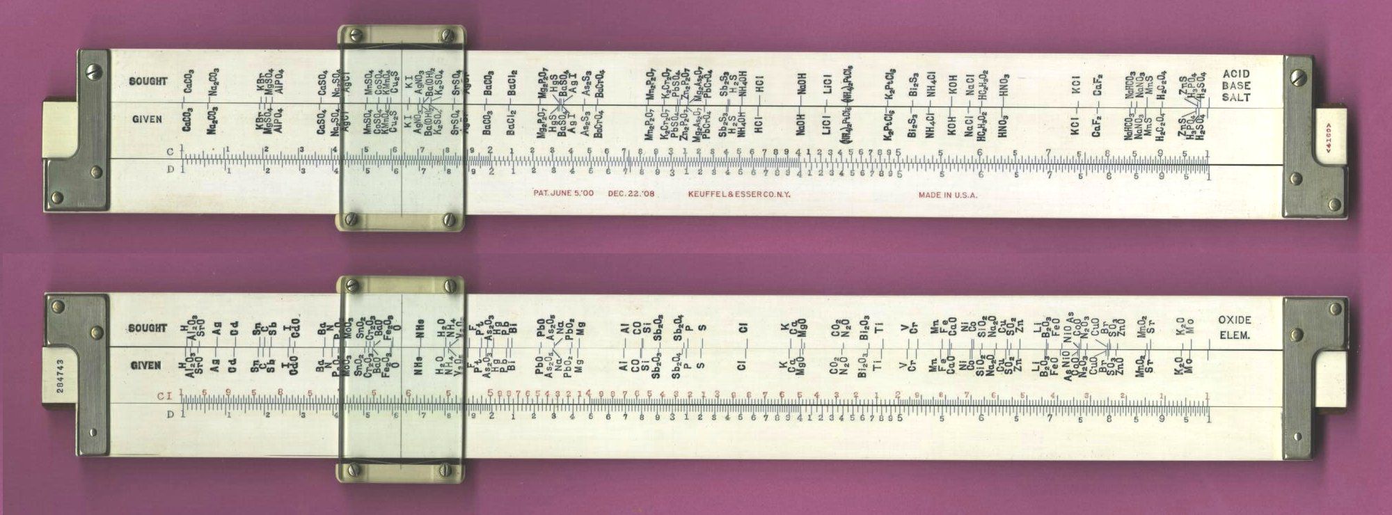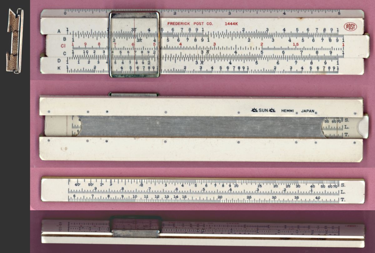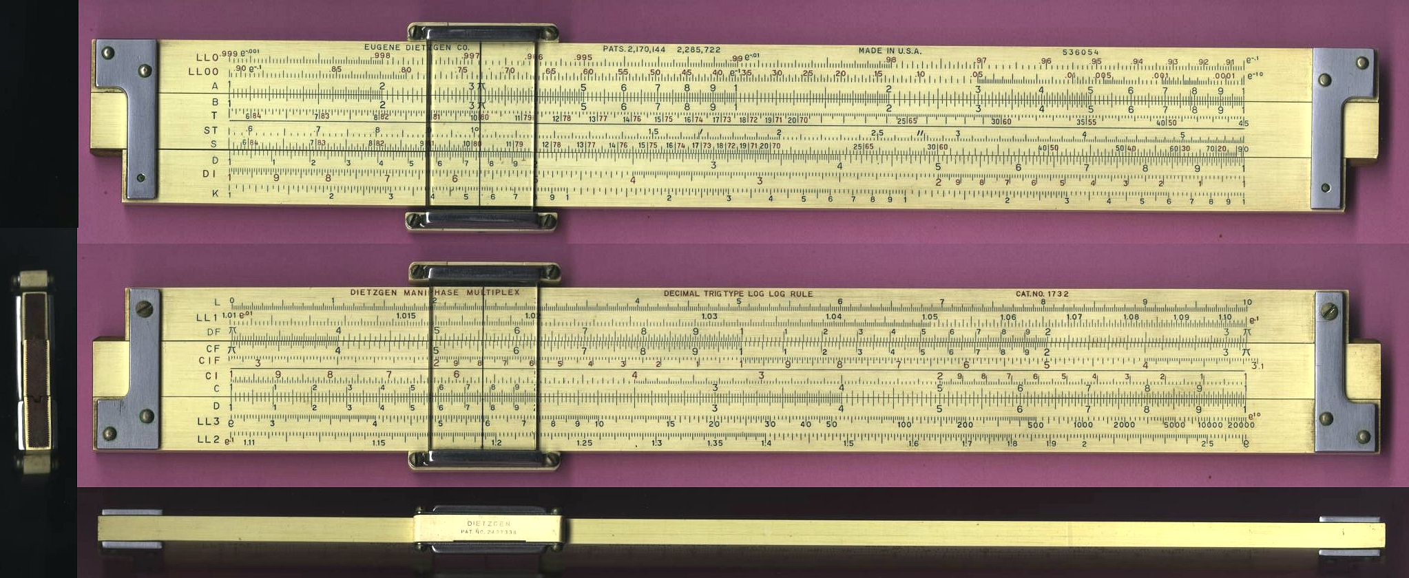 Acu-Math 130 Log Log Decimal Trig Magnesium with finger pocket on slide. | LL00, LL00, K, A [ B, K, CI, C ] D,S, ST, T L, LL, DF [ CF, CIF, CI, C ] D, LL3, LL2 |