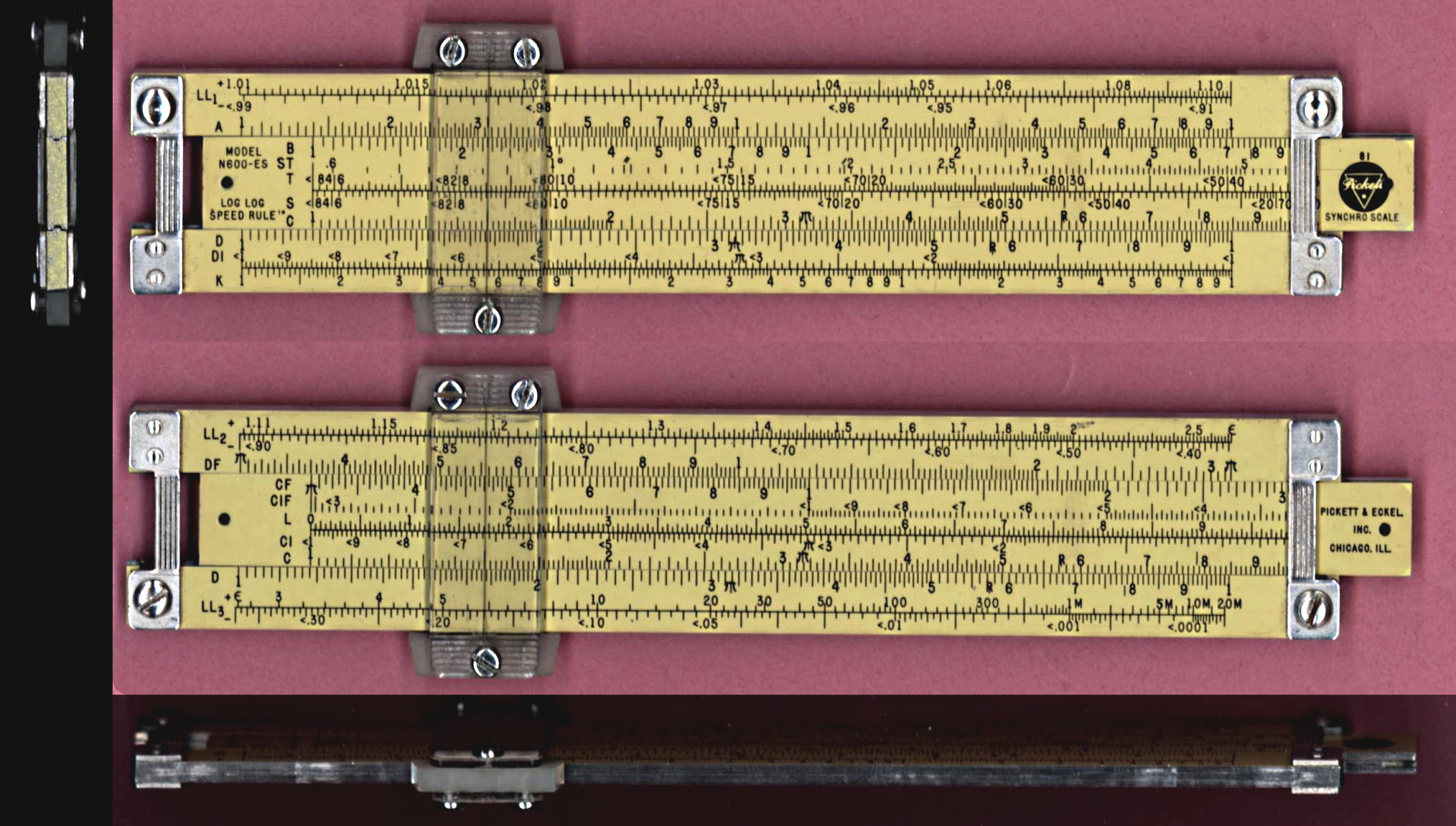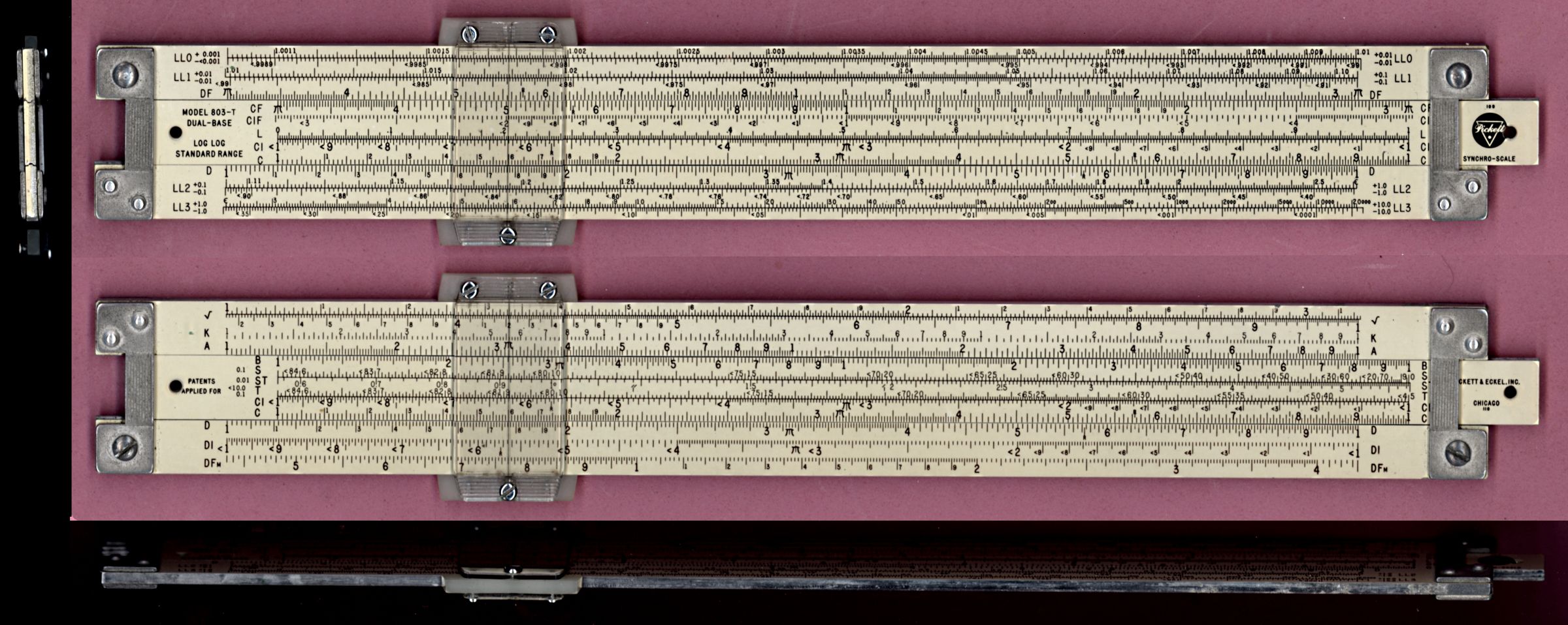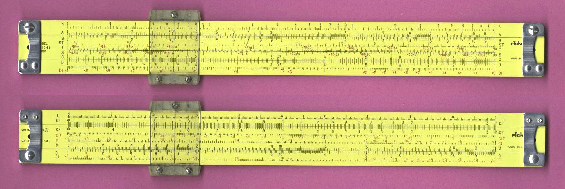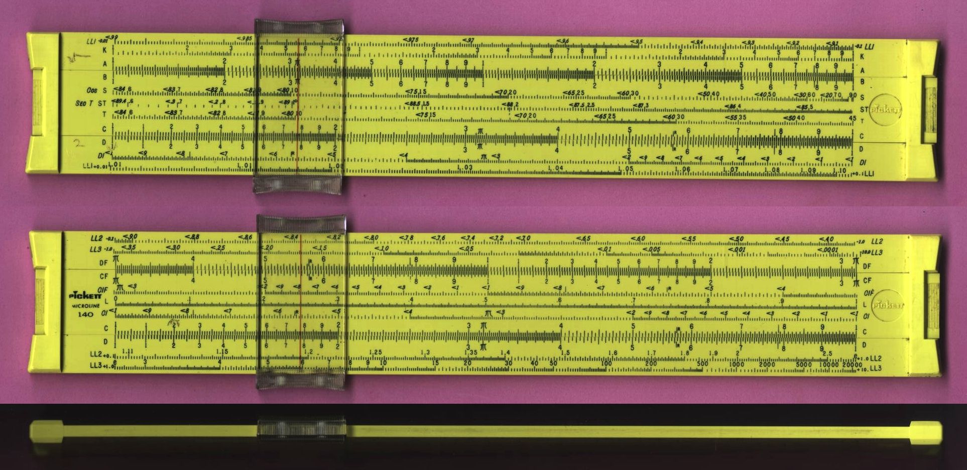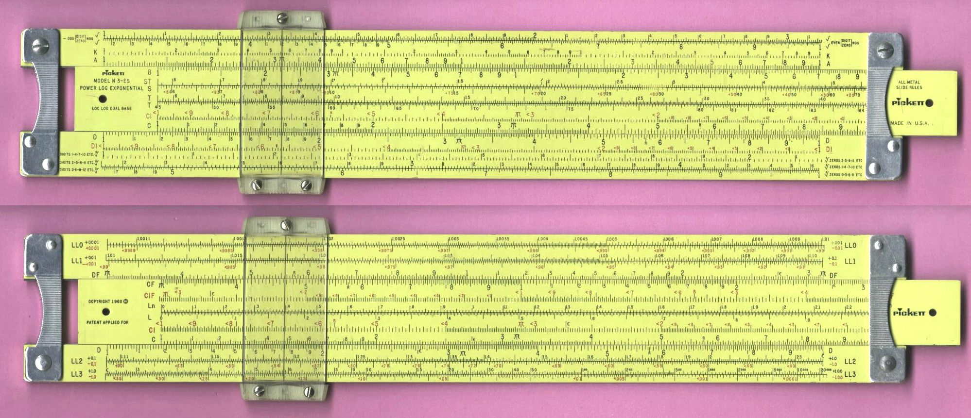 Pickett N4-ES Log Log Vector Hyperbolic Dual-Base Speed rule 1959 | LL1+.00D/-.00D, LL2+.0D/-.0D, DF/m [ CF/m, TH, SH, Ln, L, CI, C ] D, LL3+.D/-.D, LL4+D./-D. 3&rad; #1, 3&rad; #2, 3&rad; #3, DF [ CF, CIF, T1, T2, ST, S Cos, CI, C ] D, DI, &rad; #1, &rad; #2 |