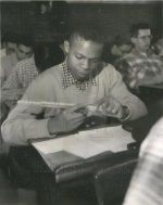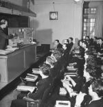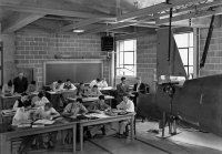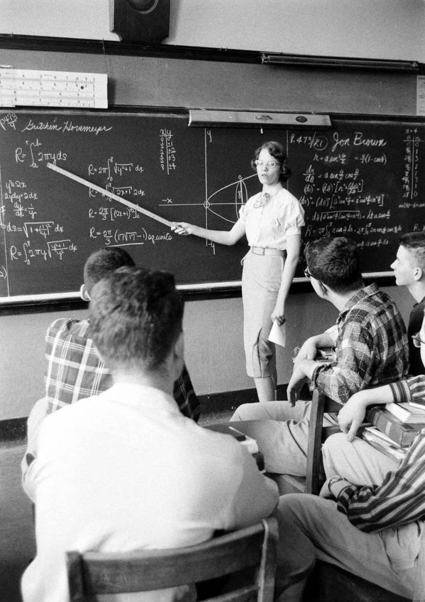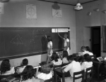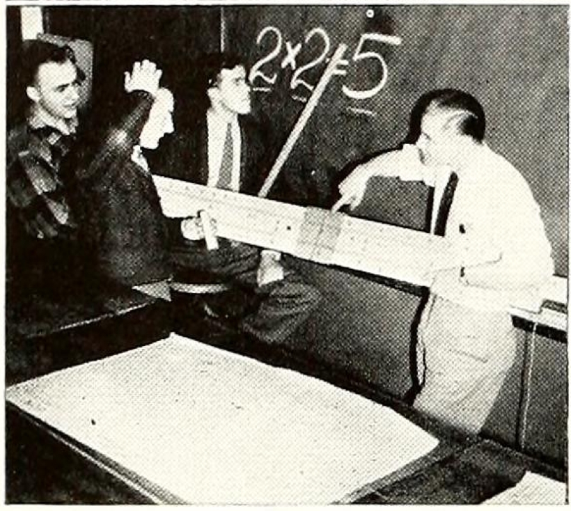 Indiana University May 18, 1947. University school math class taught by Mr. Peak. Many students using slide rules including large slide rule at head of class.