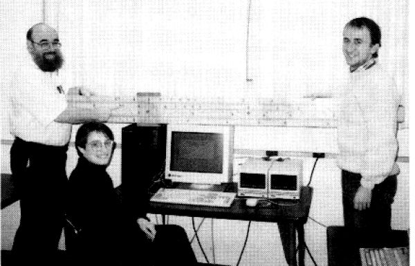 explains its use to James Perry using a 7-foot Pickett demonstation slide rule.