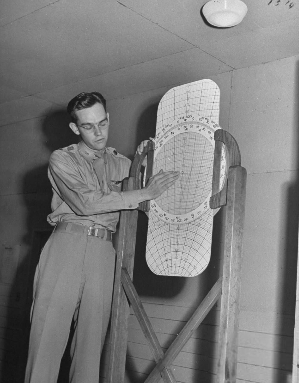 WWII Bombadier captain plotting adjustments for wind drift in nose of B-17 bomber (1942)