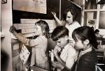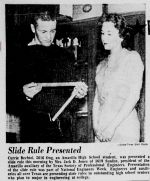 Oklahoma Times newspaper (1977) Math teacher Lucille Peters, with her obsolete model slide rule in the back ground, lectures on advanced mathematics.