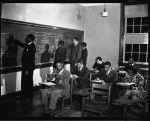 Indiana University May 18, 1947. University school math class taught by Mr. Peak. Many students using slide rules including large slide rule at head of class.